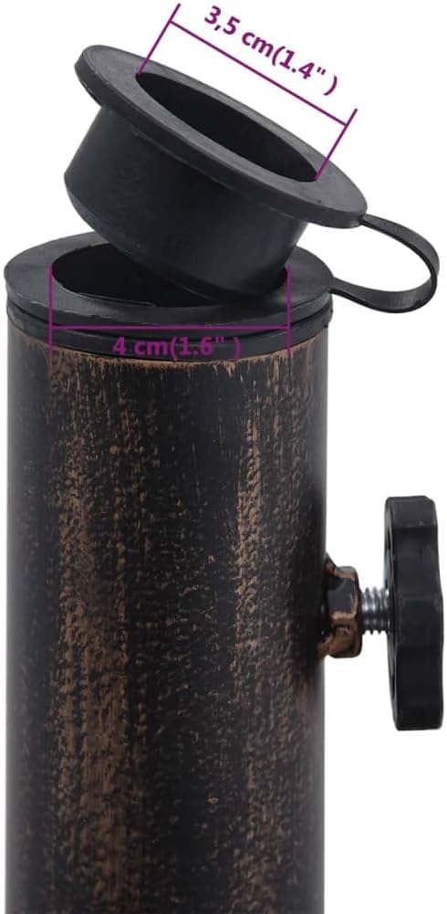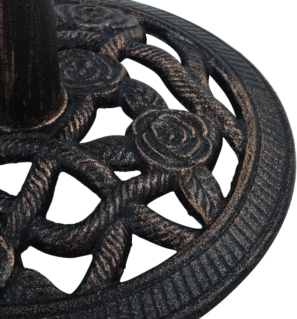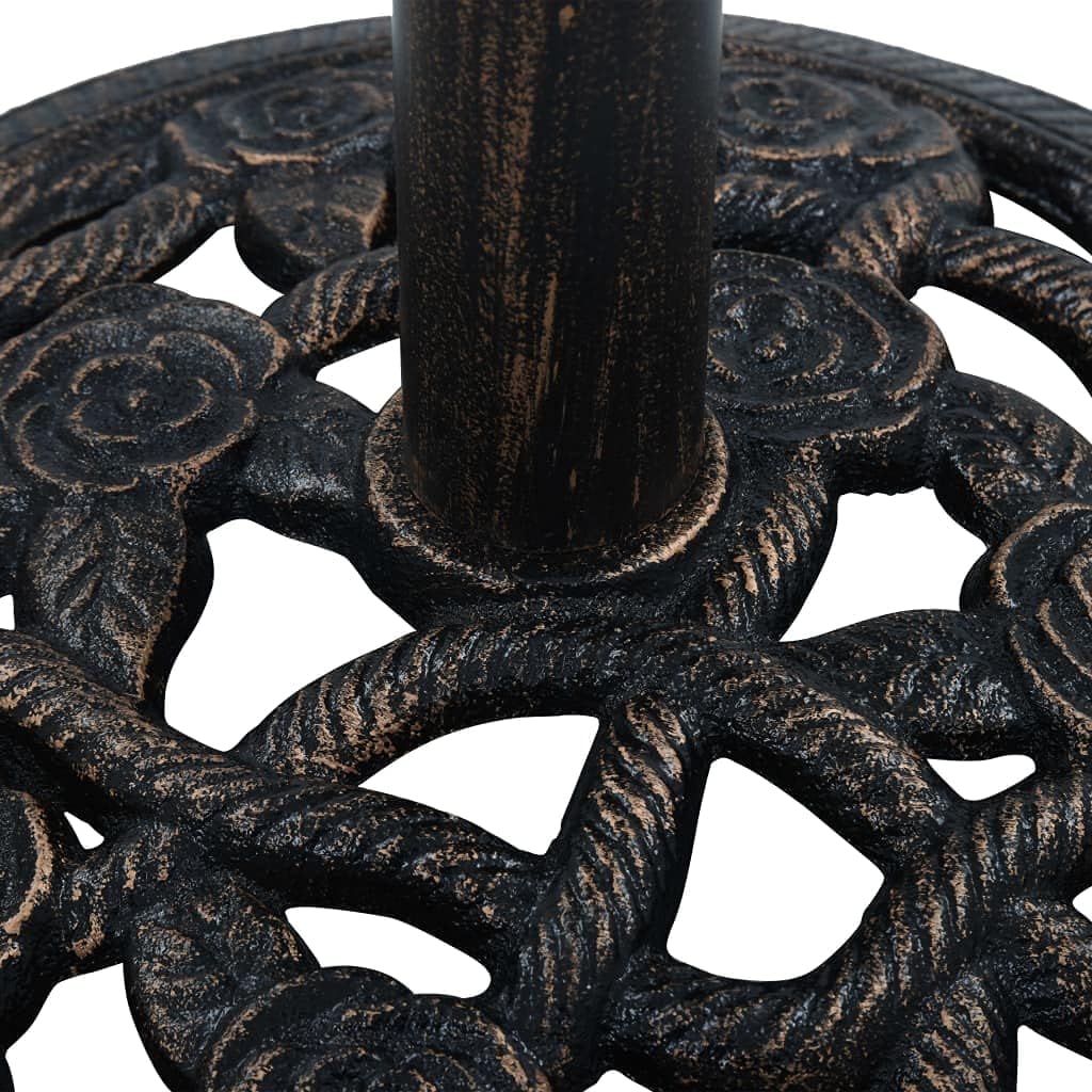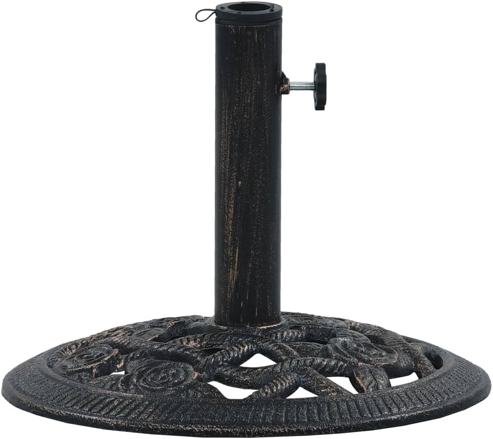 This solid umbrella holder serves as a firm and sturdy base for your umbrella and will keep it in place. The durable cast iron material ensures excellent stability.The supplied adapter is suitable for umbrella poles with a diameter of 1.4", 1.5" or 1.9". The detailed scrollwork and charming floral pattern will add a classy accent to any garden or outdoor space.●Color: Bronze●Material: Cast iron●Dimensions: 15.8" x 12.6" (Diameter x H)●Weight: 19.8 lb●Tube diameter: 2.1"●Plastic tube inner diameter: 1.4"●Support ring inner diameter: 1.6"●With an adapter for umbrella poles with a diameter of 1.4"/1.5"/1.9"